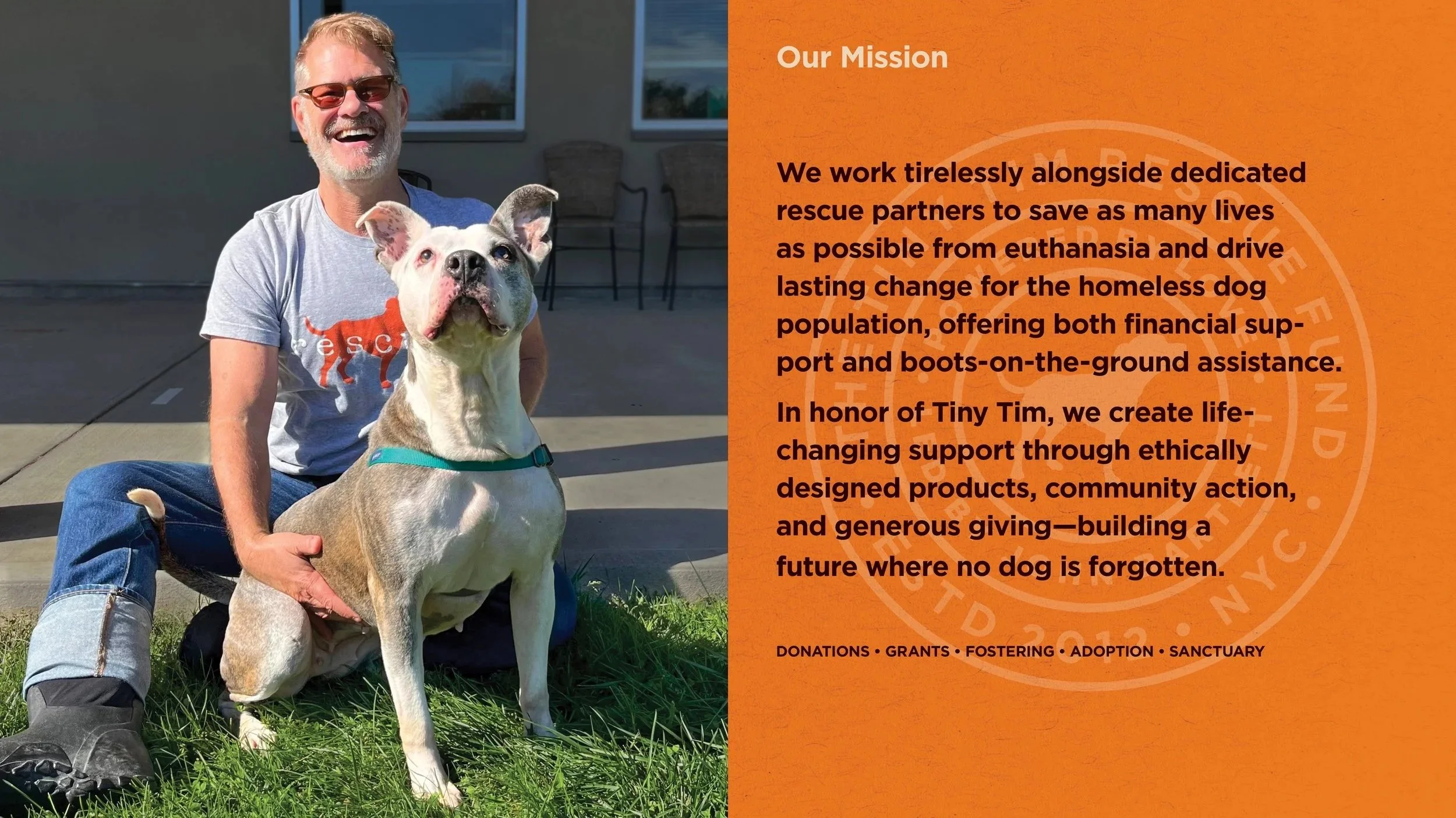 “Tiny Tim, my beloved three-legged rescue dog, ignited a fire within me to create an organization that provides the essential funding for medical care, transportation, training, and temporary boarding that these precious animals so desperately need to find their forever homes.”